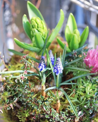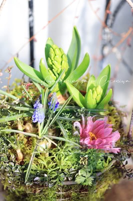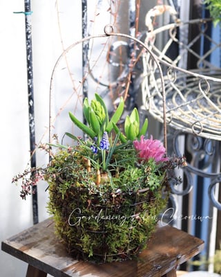 芽出し球根をハイゴケで作ったバスケットに寄せ植えするワークショップを開催します。