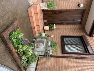 壁際に植えたバラが大きくなればまた背景に色が加わり素敵な空間になると思います。